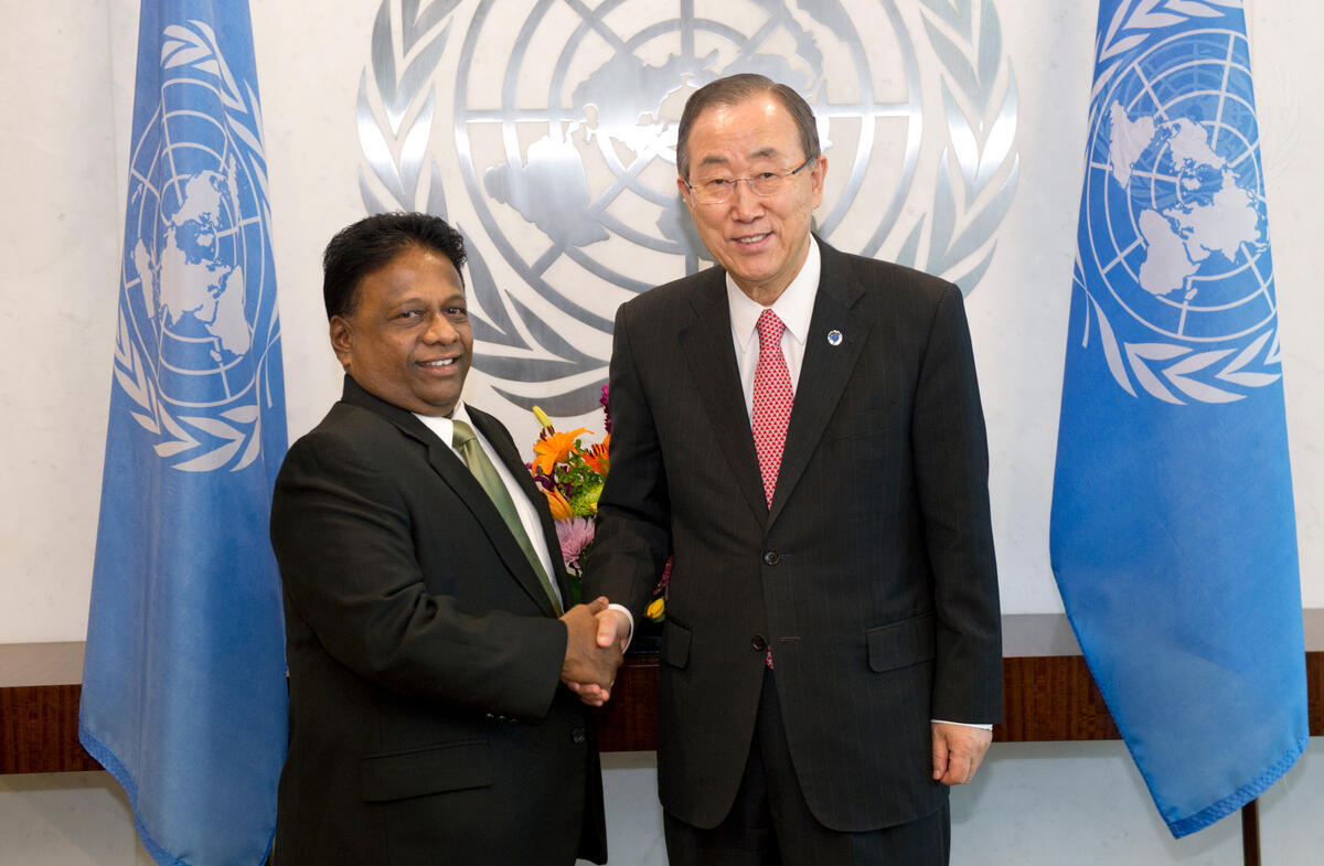 Secretary-General Ban Ki-moon (right) meets with Dullas Alahapperuma, Minister for Youth Affairs and Skills Developments of the Democratic Socialist