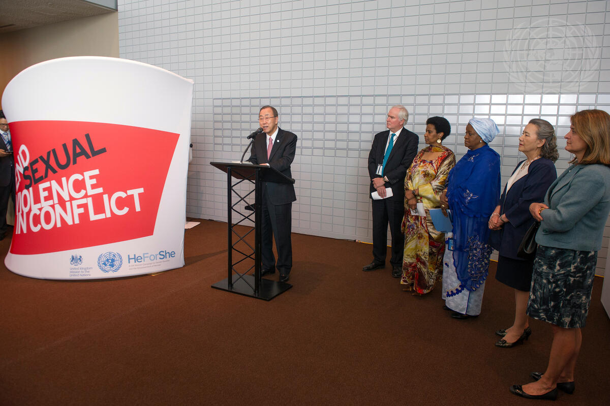 Secretary-General Ban Ki-moon (at lectern) speaks at the launch of a Campaign on Ending Sexual Violence through Gender Equality. The event was organized by the Permanent Mission of the United Kingdom to the UN. Also pictured (from left): Mark Lyall Grant, UK Permanent Representative to the UN; Phumzile Mlambo-Ngcuka, Executive Director of the United Nations Entity for Gender Equality and the Empowerment of Women (UN Women); Zainab Hawa Bangura, Special Representative of the Secretary-General on Sexual Violence in Conflict; Yoo Soon-Taek, wife of the Secretary-General.