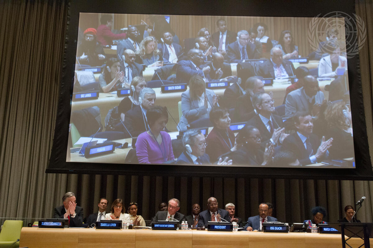 A view of the conference chamber following the opening statement by Deputy Secretary-General Jan Eliasson (third from left on dais) to the General Assembly’s high-level thematic debate on “Means of Implementation for a Transformative Post-2015 Development Agenda”. Also pictured on dais (from left): Zlatko Lagumdžija, Minister for Foreign Affairs of Bosnia and Herzegovina; Isabella Lövin, Sweden’s Minister for International Development Cooperation; Sam Kutesa, President of the sixty-ninth session of the Assembly; Tegegnework Gettu, Under-Secretary-General for General Assembly and Conference Management; and Maria Kiwanuka, Minister of Finance, Planning and Economic Development, Republic of Uganda.