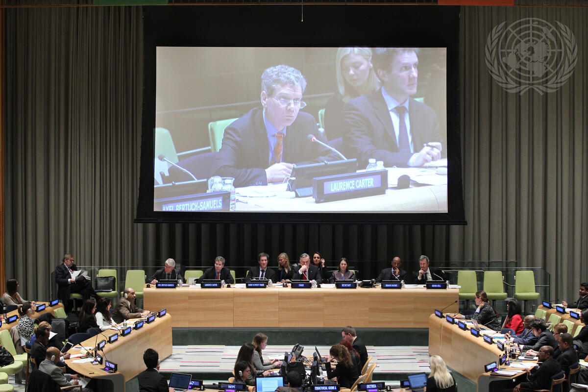 A view of the Trusteeship Council chamber, as Laurence Carter (left on screen), Senior Director for Public Private Partnerships at the World Bank Group, addresses a panel discussion on “Infrastructure Development in the Post-2015 Development Agenda and Partnerships for Realizing the Sustainable Development Goals (SDGs)”. The discussion was part of the General Assembly’s high-level thematic debate on “Means of Implementation for a Transformative Post-2015 Development Agenda”.