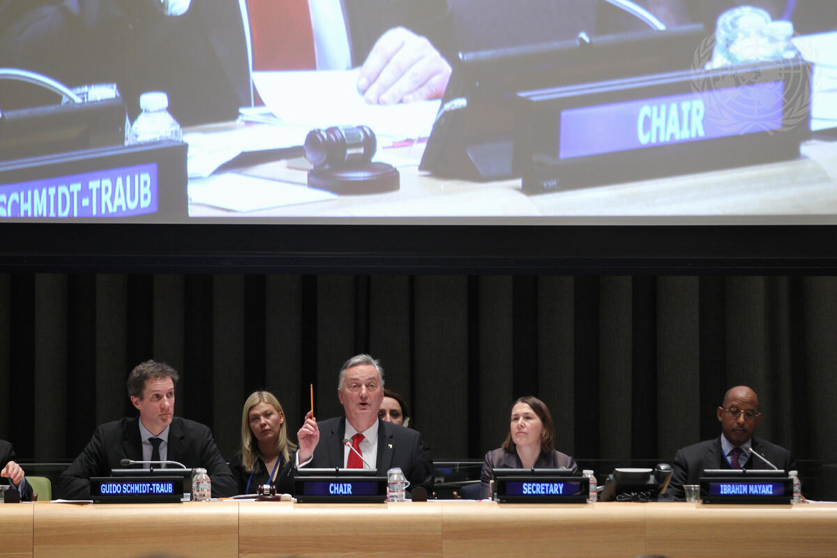 Zlatko Lagumdžija (centre left on dais), Minister for Foreign Affairs of Bosnia and Herzegovina, chairs a panel discussion on “Infrastructure Development in the Post-2015 Development Agenda and Partnerships for Realizing the Sustainable Development Goals (SDGs)”. On his right is Guido Schmidt-Traub, Executive Director of Columbia University’s Sustainable Development Solutions Network (SDSN). Also pictured: Ibrahim Assane Mayaki (right), Chief Executive Officer of the African Union’s New Partnership for Africa's Development (NEPAD). The panel discussion was part of the General Assembly’s high-level thematic debate on “Means of Implementation for a Transformative Post-2015 Development Agenda”.