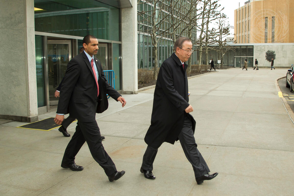 Secretary-General Ban Ki-moon (right) is leaving UN Headquarters to visit Russia and Ukraine as part of his diplomatic efforts to encourage all parties to resolve the current crisis in Ukraine peacefully.