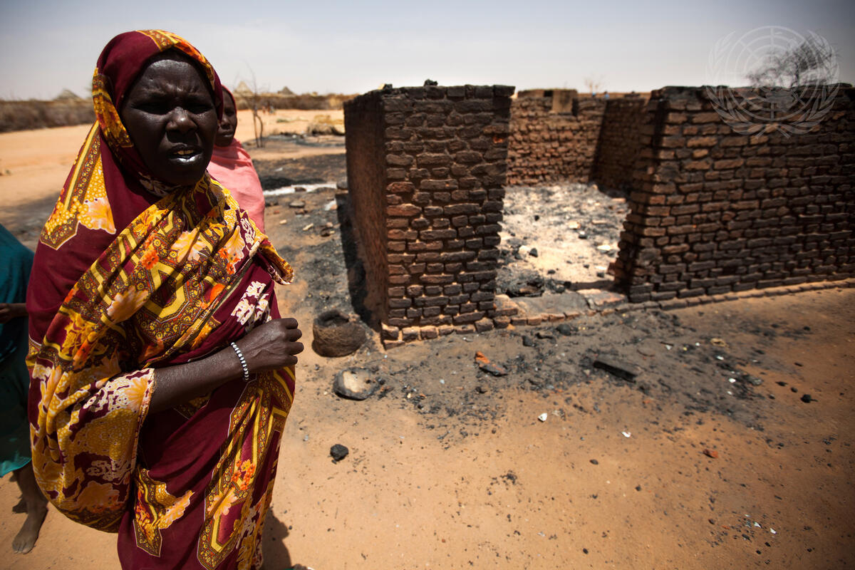 A woman in Mellit, North Darfur, stands next to her house which was destroyed during the clashes between Government forces and armed rebel groups on 13 March.