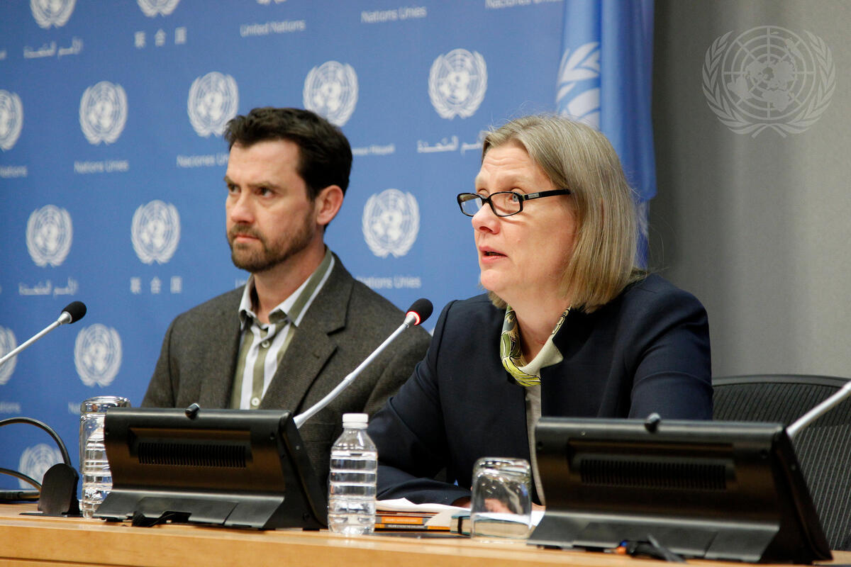 Vibeke Jensen (right), Director of the New York Office of the UN Educational, Scientific and Cultural Organization (UNESCO), briefs journalists. Also briefing with her was Richard Connor, lead author of the report.
