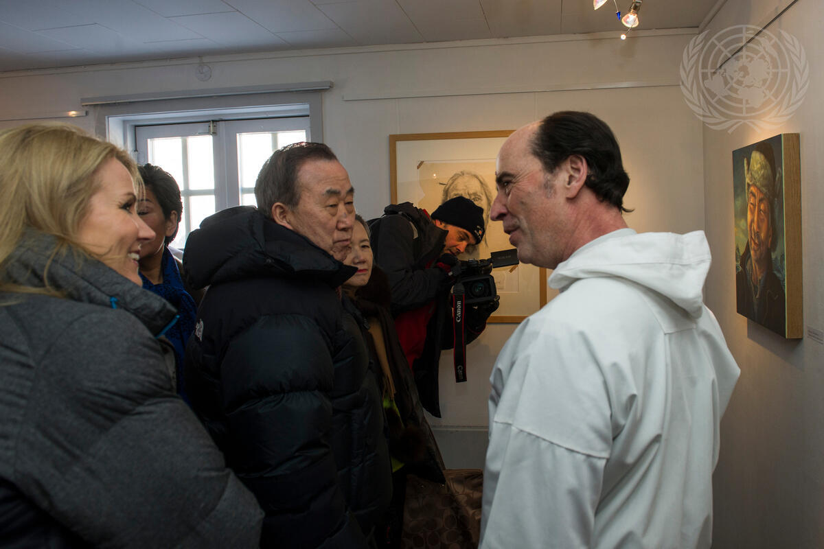 Helle Thorning-Schmidt (left), Prime Minister of Denmark, Secretary-General Ban Ki-moon (second from left) and his wife, Yoo Soon-taek (third from left), are given a tour at a local art gallery in Uummannaq.