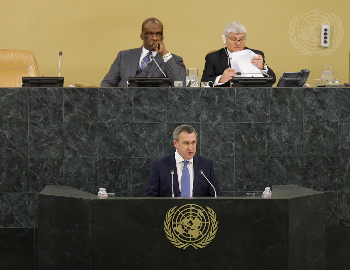 Andrii Deshchytsia, Acting Minister for Foreign Affairs of Ukraine, addresses the Assembly. Behind him are pictured John Ashe (left), President of the Assembly’s sixty-eighth session; and Ion Botnaru, Director of the General Assembly and Economic and Social Council (ECOSOC) Affairs Division.