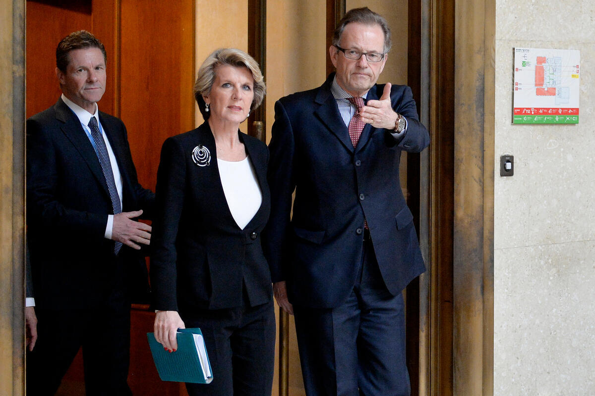 Michael Møller (right), Acting Director-General, United Nations Office at Geneva (UNOG) with Julie Bishop (centre), Minister for Foreign Affairs of the Commonwealth of Australia, and Peter Woolcoot (left), Permanent Representative of Australia at UNOG, before a Meeting of the Conference on Disarmament.