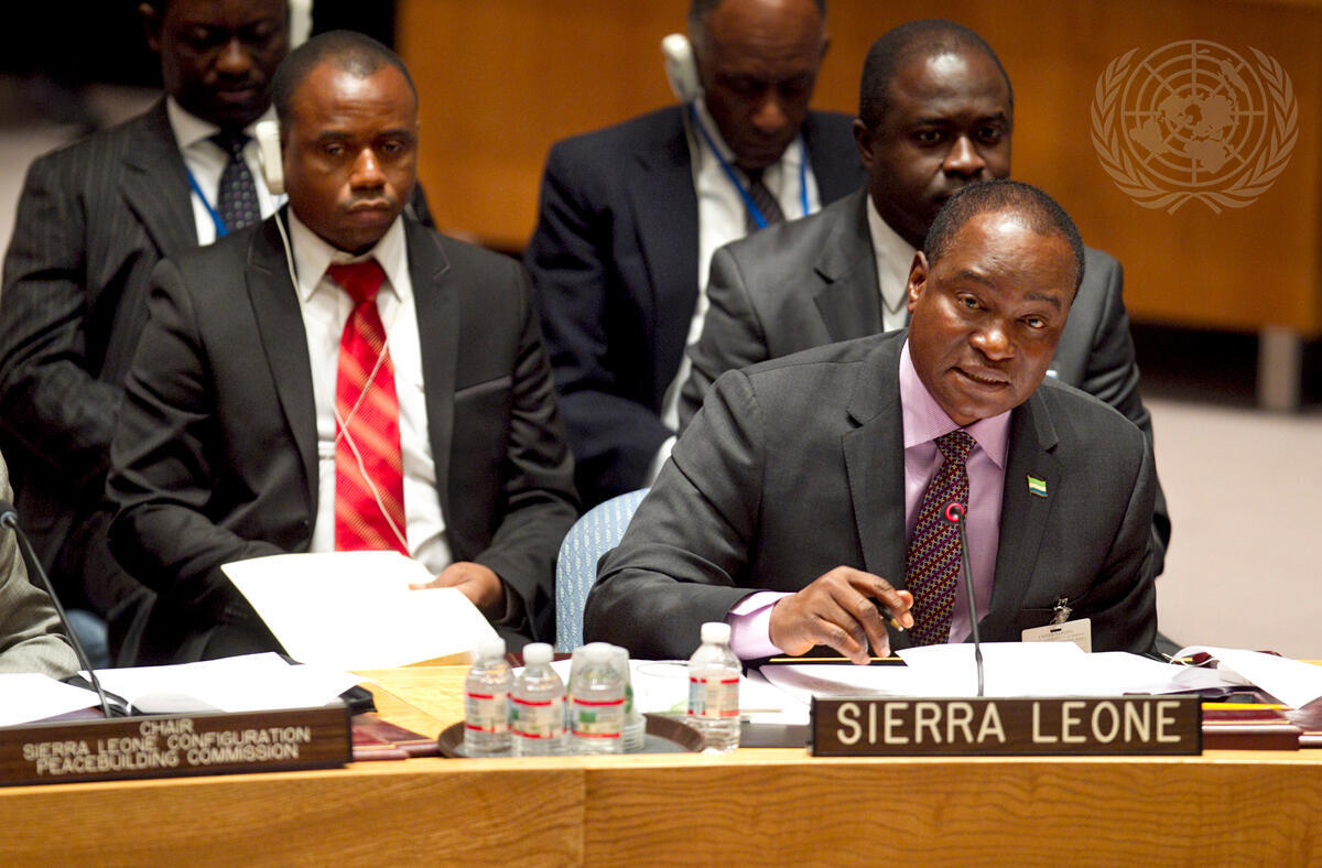 Samura M.W. Kamara (right), Minister for Foreign Affairs and International Cooperation of the Republic of Sierra Leone, addresses the Council. Directly behind him is Vandi Chidi Minah (right), Permanent Representative to the UN.
