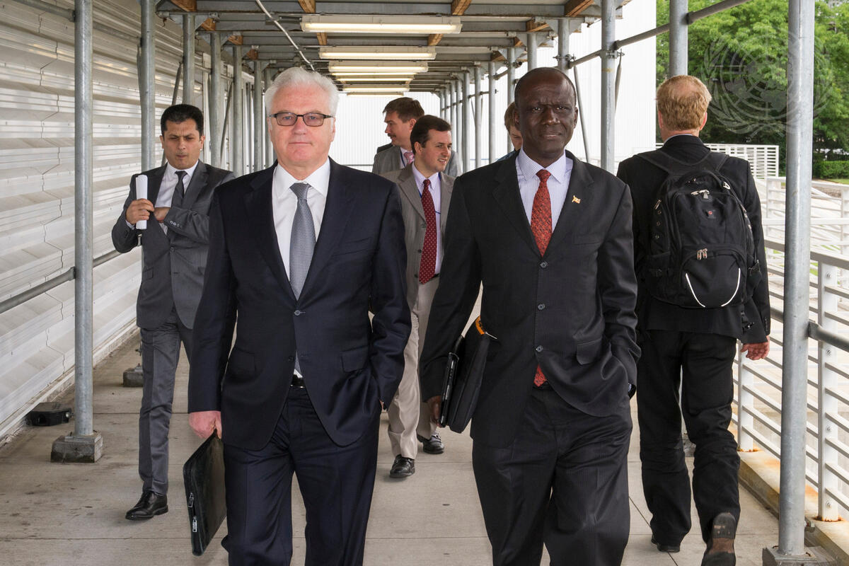 Vitaly I. Churkin (centre left), Permanent Representative of the Russian Federation to the UN and President of the UN Security Council for June, with Mull Katende (centre right), Permanent Representative of the Republic of Uganda to the African Union and Chair of the African Union Peace and Security Council (AUPSC) for June, on their way to jointly address journalists, following the conclusion of the eighth Annual Joint Consultative Meeting between the Security Council and the AUPSC.