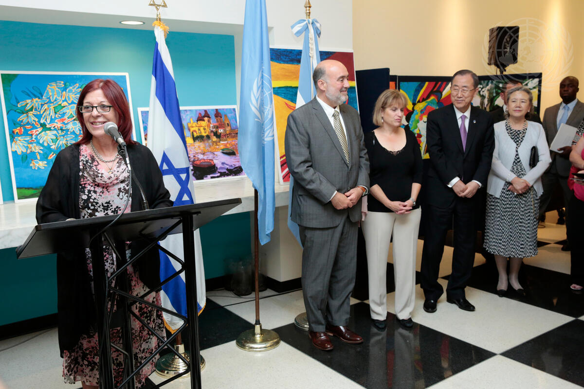 María Cristina Perceval (left), Permanent Representative of Argentina to the UN, speaks at the opening of “Speaking Colors”, an exhibition of paintings by Israeli children with autism. The exhibit was organized by the non-governmental organization ALUT (Israeli Society for Autistic Children), and co-sponsored by the Permanent Missions of Israel and Argentina to the UN. Also pictured (from left): Ron Prosor, Permanent Representative of Israel to the UN; his wife Hadas; Secretary-General Ban Ki-moon; and Mr. Ban’s wife, Yoo Soon-taek.
