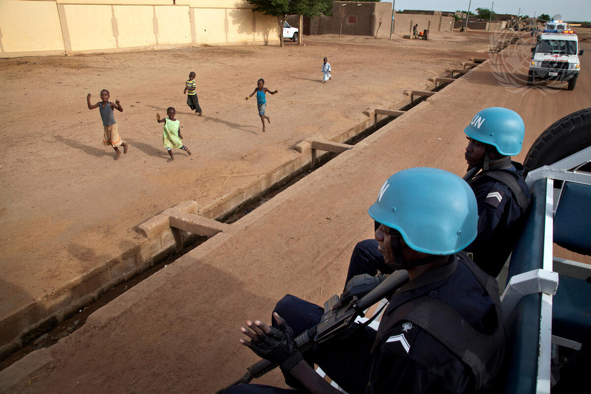 Senegalese police officers serving with the UN Multidimensional Integrated Stabilization Mission in Mali (MINUSMA), patrol the streets of the city of Gao, in Mali.