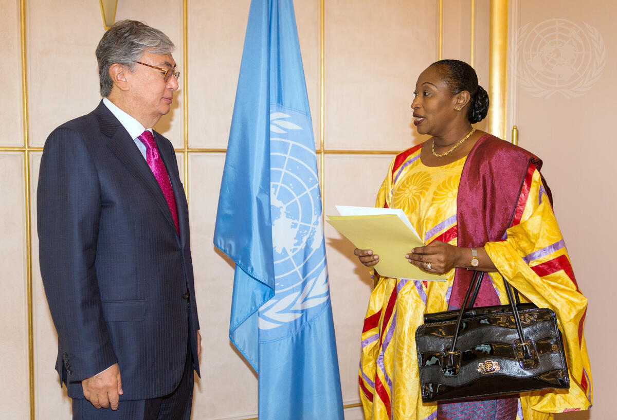 Aya Thiam Diallo (right), new Permanent Representative of the Republic of Mali to the United Nations Office at Geneva (UNOG), presents her credentials to UNOG Director-General Kassym-Jomart Tokayev.