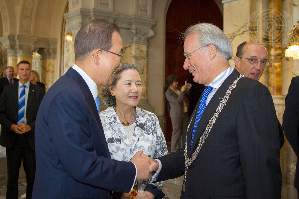Secretary-General Ban Ki-moon (left) and his wife, Yoo Soon-taek, with Jozias J. van Aartsen, Mayor of The Hague, at the commemoration of the centennial of the Peace Palace.