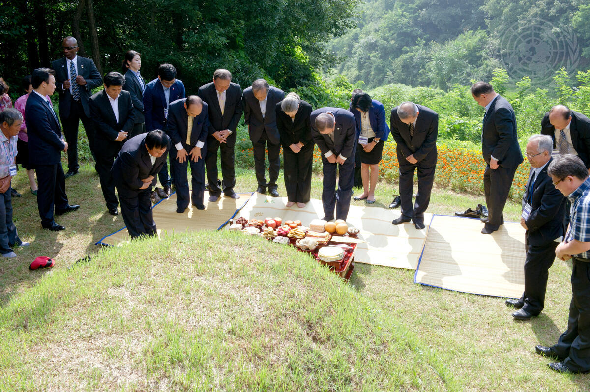 Secretary-General Ban Ki-moon (centre right) visits his birthplace and hometown of Eumseong County, in North Chungcheong Province of the Republic of Korea. During his visit, Mr. Ban made stops at the house where he was born, the family grave, a temple and a museum. On Mr. Ban's right is his wife, Yoo soon-taek.