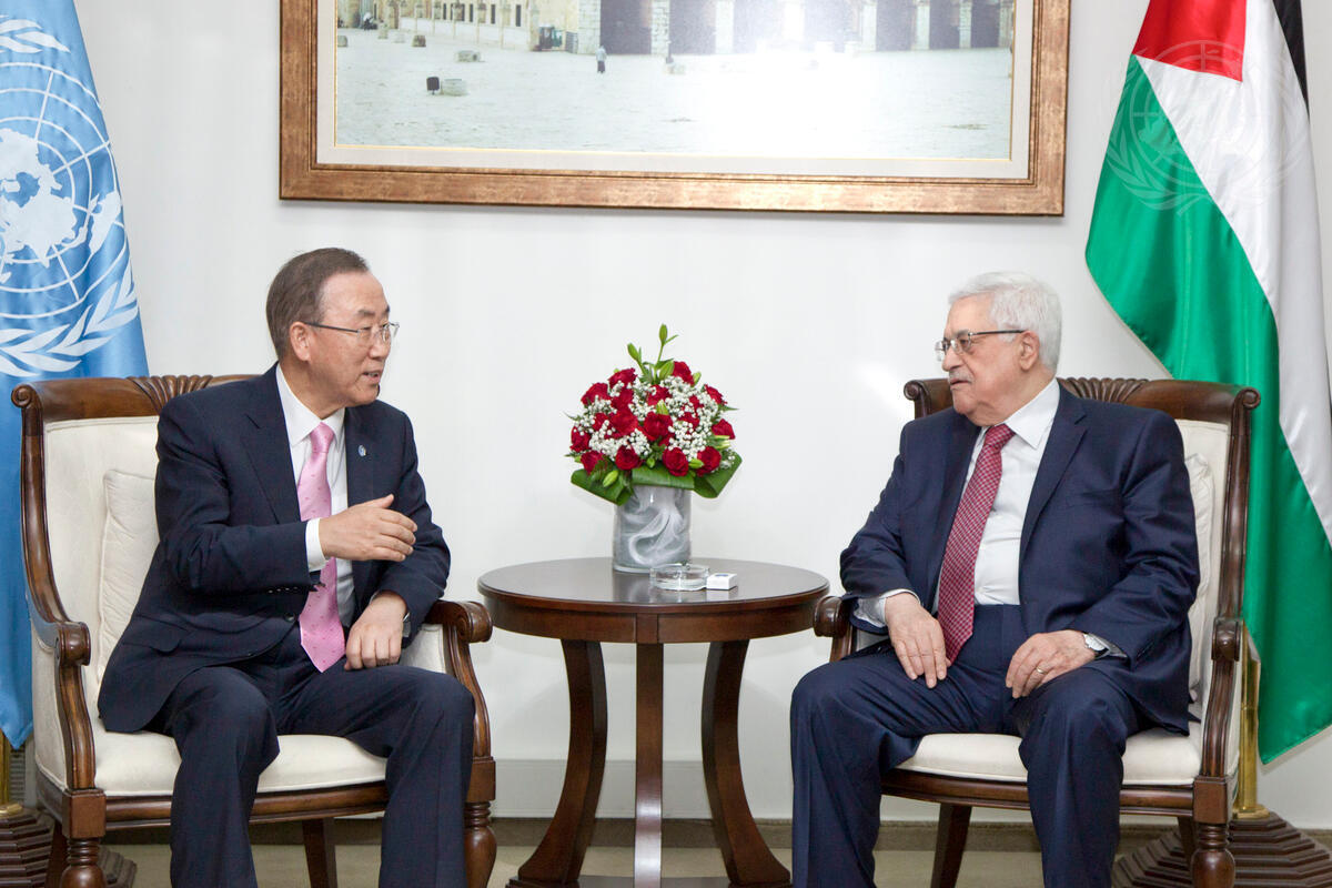 Secretary-General Ban Ki-moon (left) meets with Mahmoud Abbas, President of the State of Palestine.