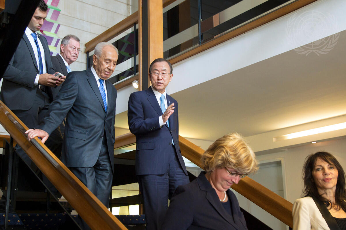 Secretary-General Ban Ki-moon (centre right) meets with Shimon Peres (centre left), President of Israel.