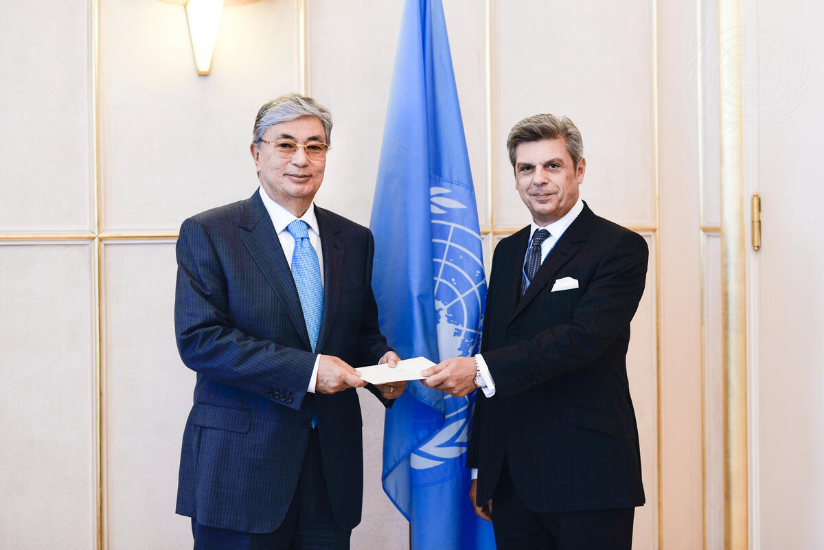 Maurizio Enrico Serra (right), new Permanent Representative of Italy to the United Nations Office at Geneva (UNOG), presents his credentials to UNOG Director-General Kassym-Jomart Tokayev.
