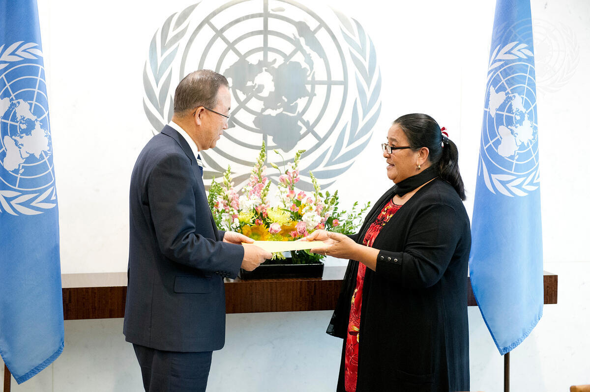 Makurita Baaro (right), new Permanent Representative of Kiribati to the United Nations, presents her credentials to Secretary-General Ban Ki-moon.