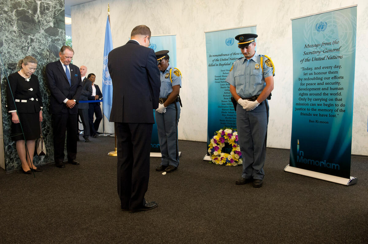 Secretary-General Ban Ki-moon (centre) lays a wreath in memory of the United Nations staff members killed by the bombing of the UN headquarters in Baghdad on 19 August 2003. Organized by the UN Staff Union, the ceremony honoured as well all staff who made the ultimate sacrifice in the service of peace. Also pictured (from left): the Secretary-General's wife, Yoo Soon-taek; and Deputy Secretary-General Jan Eliasson.
