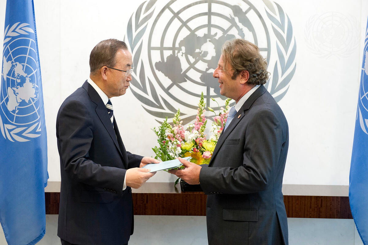Milan Milanovic (right), new Permanent Representative of the Republic of Serbia to the United Nations, presents his credentials to Secretary-General Ban Ki-moon.