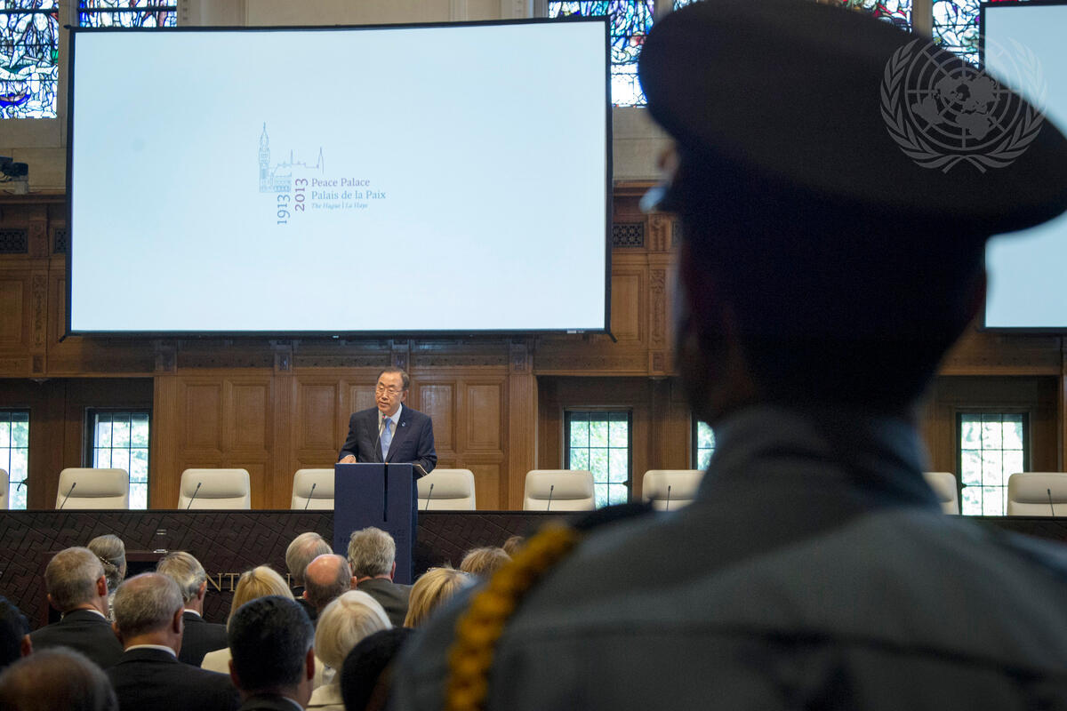 Secretary-General Ban Ki-moon speaks at the ceremony marking the 100th anniversary of the Peace Palace, seat of the International Court of Justice, in The Hague.