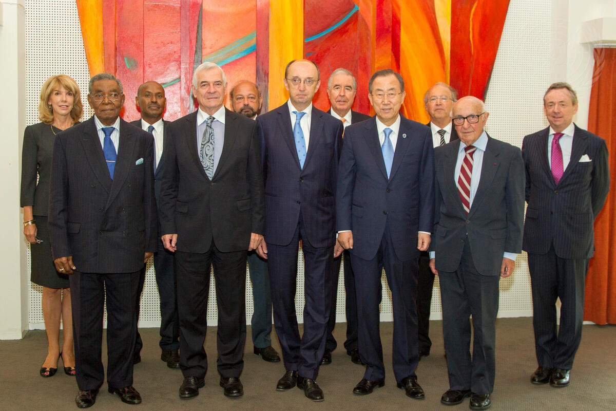 In The Haguue for the commemoration of the 100th anniversary of the Peace Palace, seat of the International Court of Justice (ICJ), Secretary-General Ban Ki-moon (second from right, front row) meets with heads of international courts and tribunals, including (from left, front row): Judge George Gelaga King, President of the Special Court for Sierra Leone; Judge Sir David Baragwanath, President of the Special Tribunal for Lebanon; ICJ President Judge Peter Tomka; and Judge Theodor Meron, President of the International Criminal Tribunal for the Former Yugoslavia. Also pictured: Patricia O’Brien (far left), Under-Secretary-General for Legal Affairs and United Nations Legal Counsel; and ICJ Registrar Philippe Couvreur (far right).