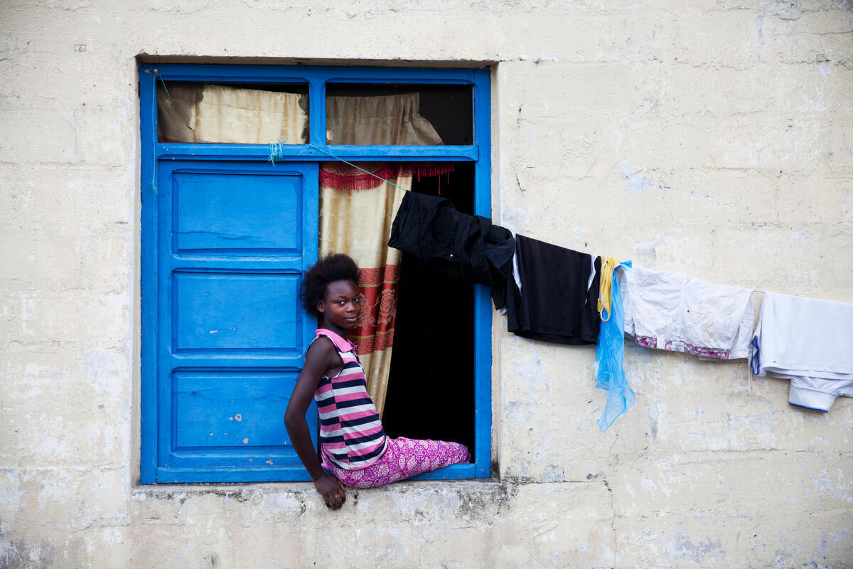 An expelled young girl at the window of a classroom converted into a dormitory, at the Maluku transit camp.