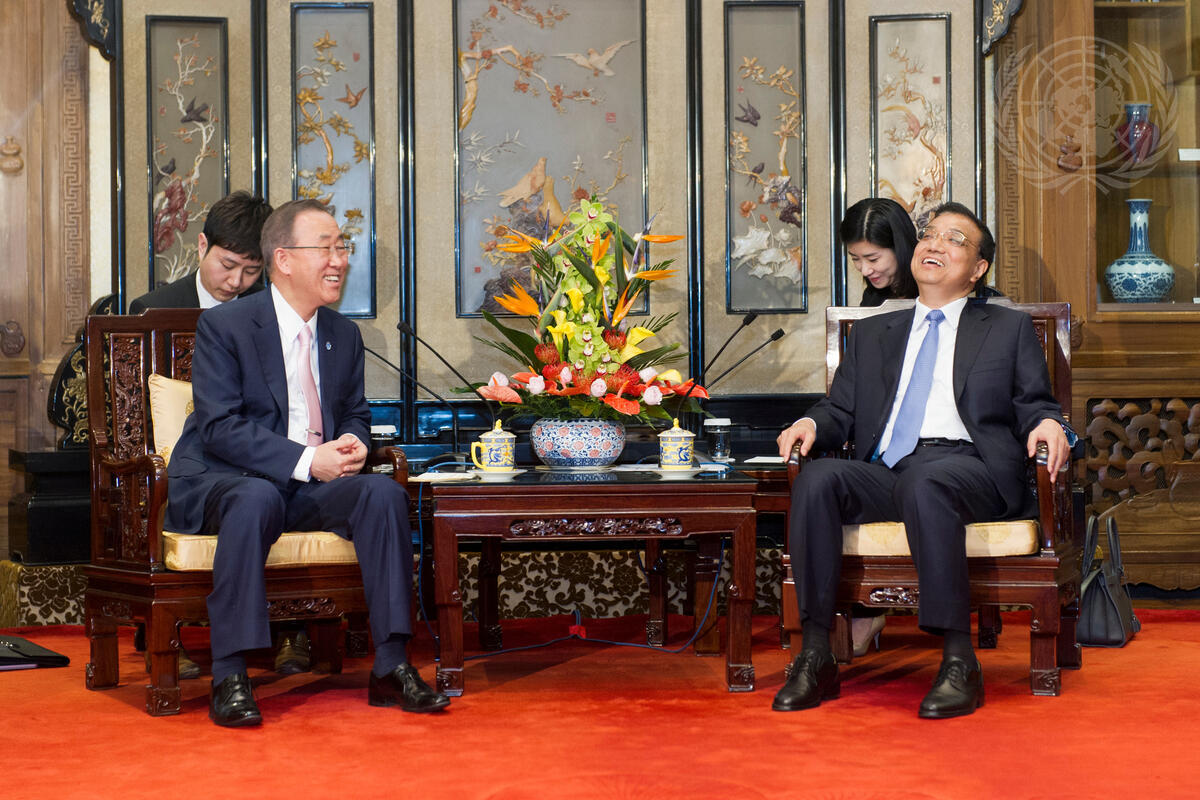 Secretary-General Ban Ki-moon (left) meets with Li Keqiang, Premier of the State Council of the People’s Republic of China, at the Diaoyutai State Guesthouse during his official visit to China.