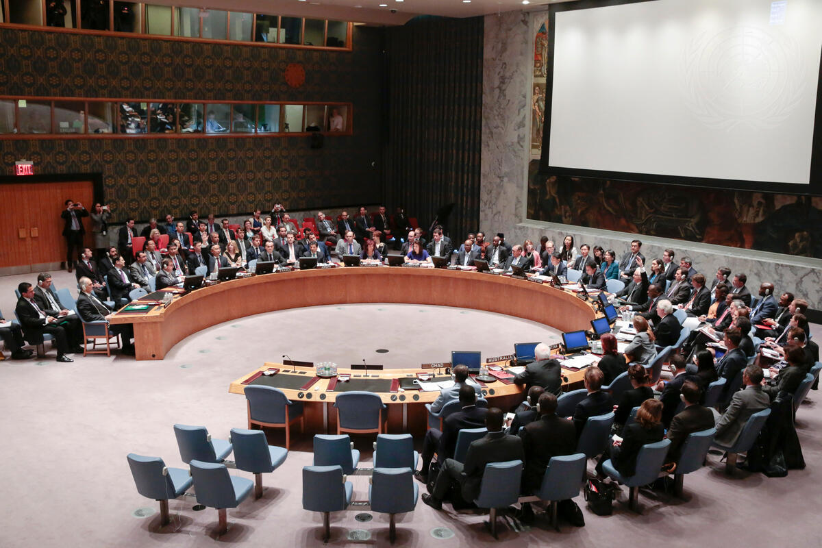 A wide view of the Council Chamber as the representatives of China (second from left, top) and the Russian Federation (seventh from left, foreground) vote against the draft resolution.