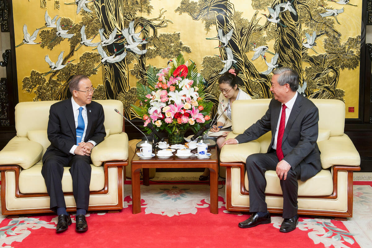 Secretary-General Ban Ki-moon (left) meets with Li Congjun, President of Xinhua News Agency, in Beijing, China.