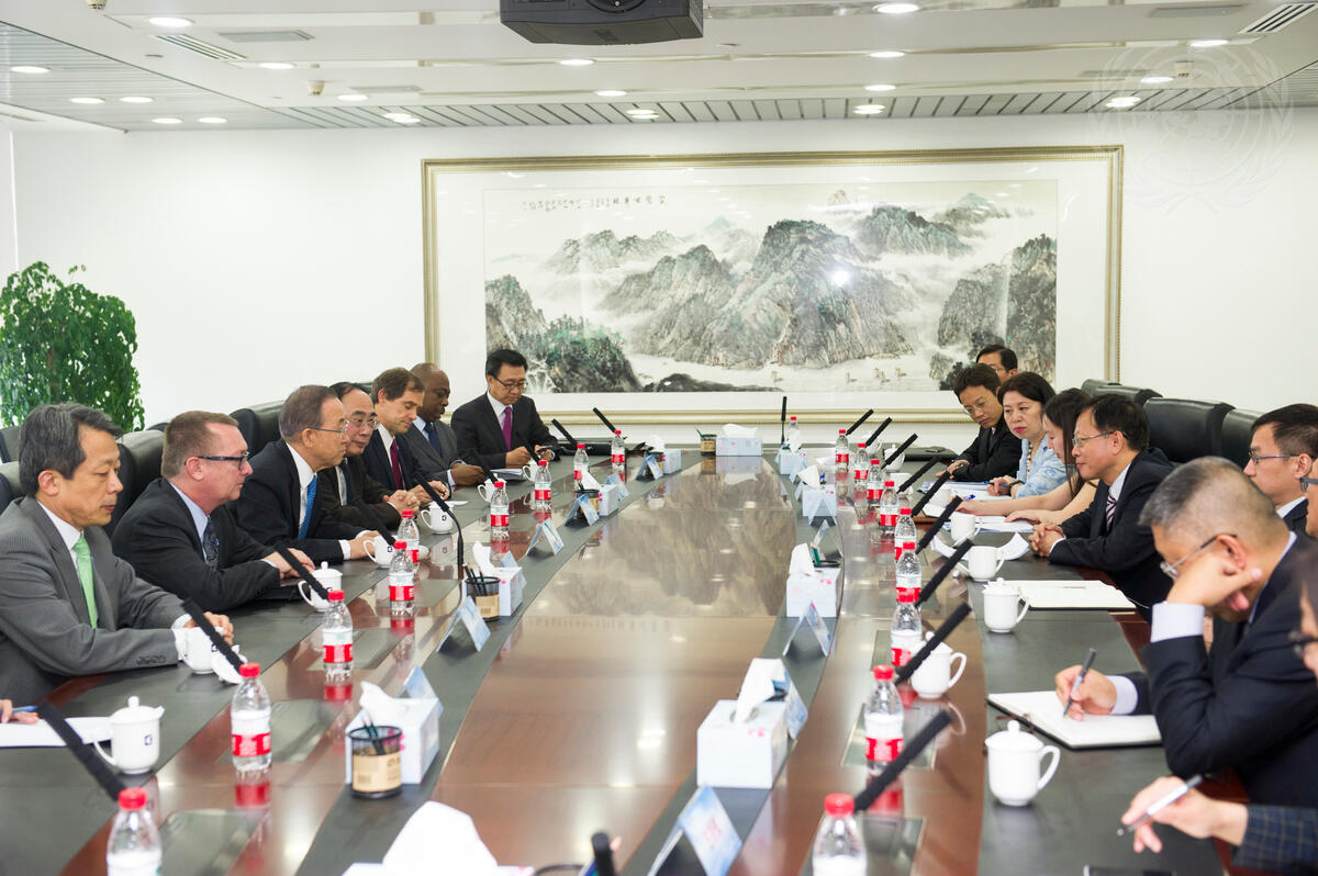 Secretary-General Ban Ki-moon (third from left) meets with Ding Xuedong (centre right), Chairman of the China Investment Corporation (CIC), in Beijing, China.