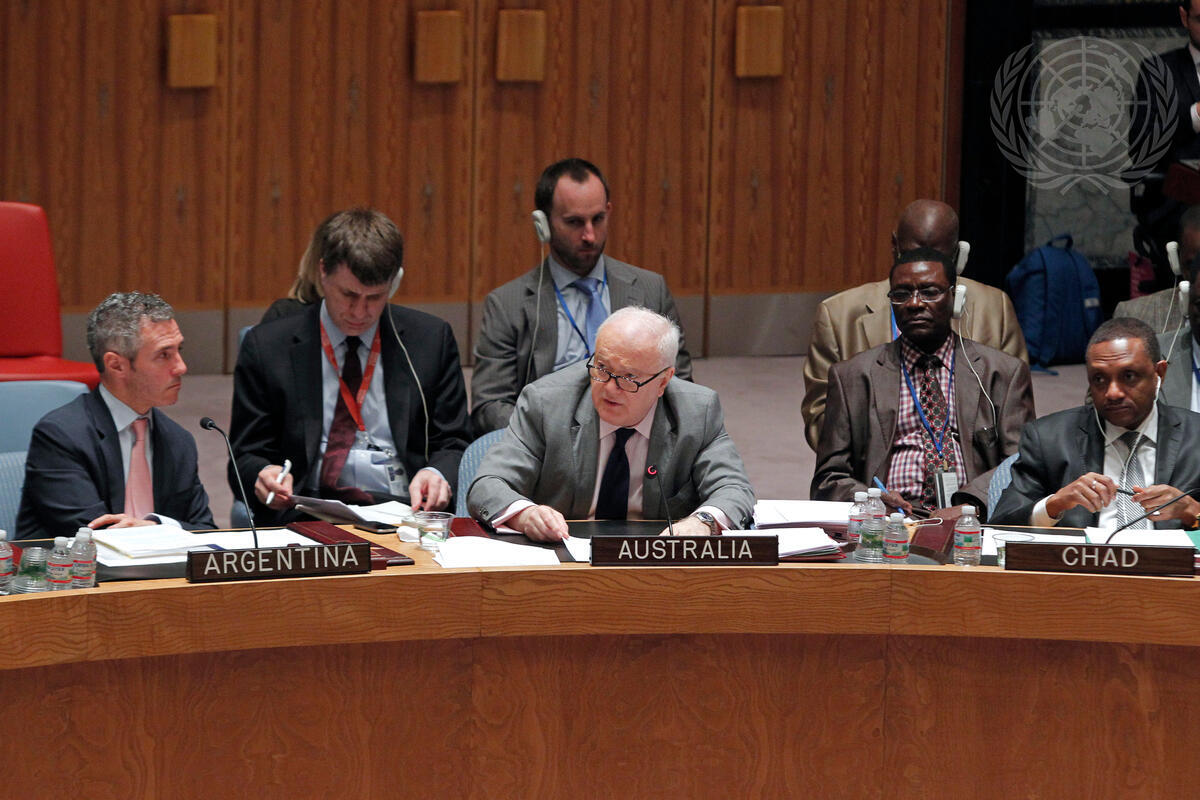 Gary Quinlan (centre), Permanent Representative of Australia to the UN and Chair of Committee dealing with sanctions on Al-Qaida, briefs the Council.