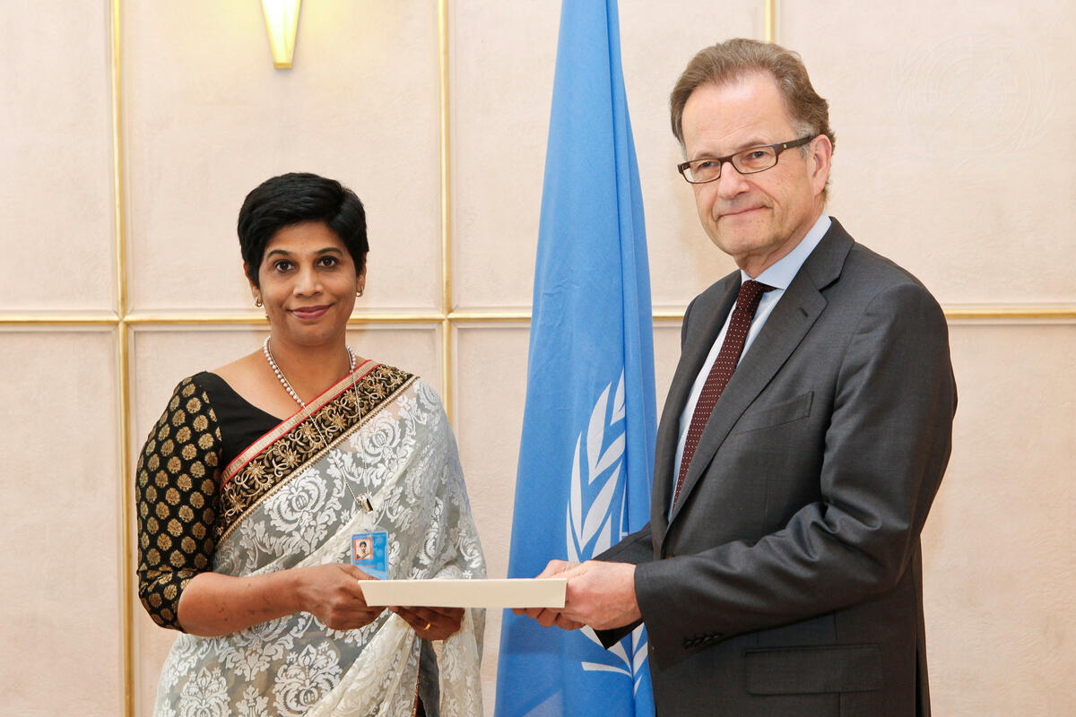 Nazhat Shameem (left), new Permanent Representative of the Republic of Fiji to the United Nations Office at Geneva (UNOG), presents her credentials to Michael Møller, Acting Director-General of UNOG.