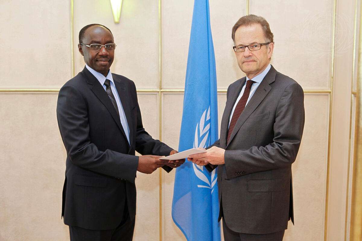 François Xavier Ngarambé (left), new Permanent Representative of the Republic of Rwanda to the United Nations Office at Geneva (UNOG), presents his credentials to Michael Møller, Acting Director-General of UNOG.