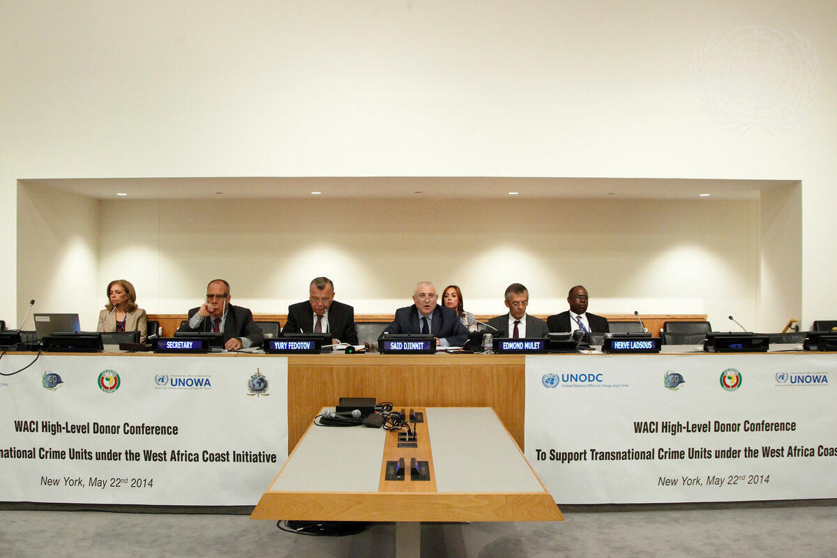 A view of the speakers’ dais as Said Djinnit (centre right), Special Representative of the Secretary-General and Head of the UN Office for West Africa (UNOWA), addresses a high-level donor conference to support Transnational Organized Crime Units under the West Africa Coast Initiative (WACI). The conference was co-organized by UNOWA, the UN Office on Drugs and Crime (UNODC), the Department of Peacekeeping Operations (DPKO) and the International Criminal Police Organization (INTERPOL). On Mr. Djinnit’s right is UNODC Executive Director Yury Fedotov.