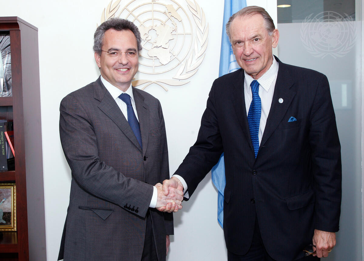 Deputy Secretary-General Jan Eliasson (right) meets with Marco Impagliazzo, President of the Comunità di Sant'Egidio, a Christian association dedicated to evangelisation and charity.