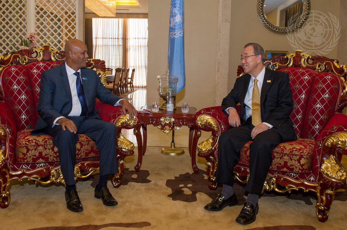 Secretary-General Ban Ki-moon (right) meets with Abdiweli Sheikh Ahmed, Prime Minister of the Somali Republic, on the margins of the African Union Summit in Malabo, Equatorial Guinea.