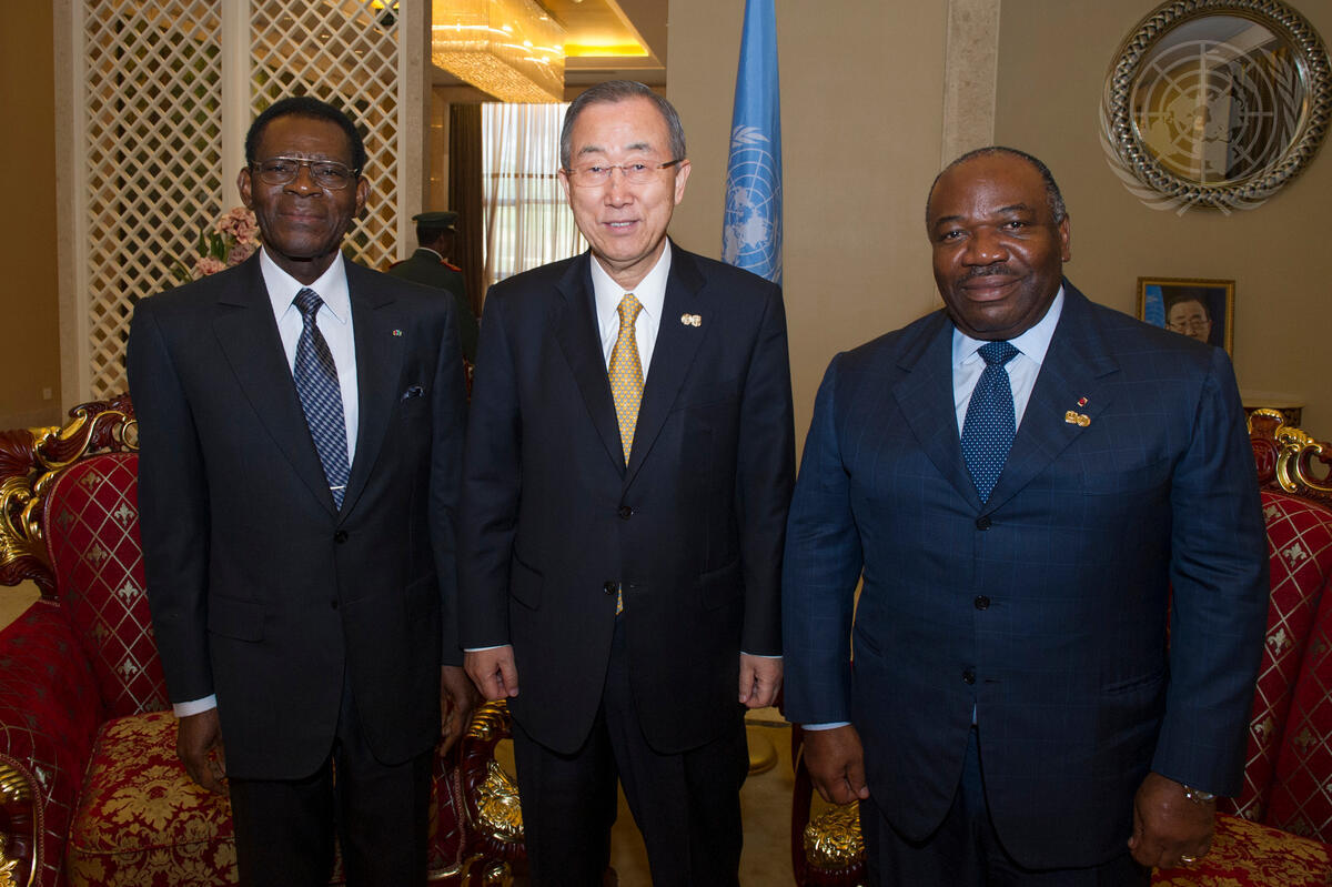 Secretary-General Ban Ki-moon (centre) holds a trilateral meeting with Teodoro Obiang Nguema Mbasogo (left), President of the Republic of Equatorial Guinea and Ali Bongo Ondimba, President of the Republic of Gabon, on the margins of the African Union Summit in Malabo, Equatorial Guinea.