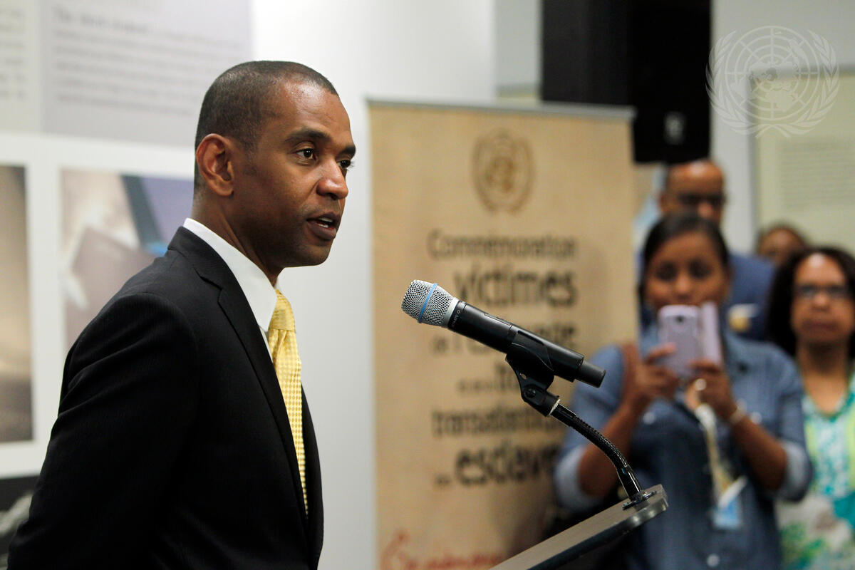 Rodney Leon, architect and designer of the Permanent Memorial to the Victims of Slavery and the Transatlantic Slave Trade, which will be built on the grounds of the UN headquarters, speaks at the opening of a photo exhibit entitled “Victory over Slavery: Haiti and beyond”. The exhibit was sponsored by the Permanent Missions of Haiti and Jamaica to the United Nations and presented by the Outreach Division of the UN Department of Public Information, in partnership with the Nantes Memorial to the Abolition of Slavery in France, and Mr. Leon.