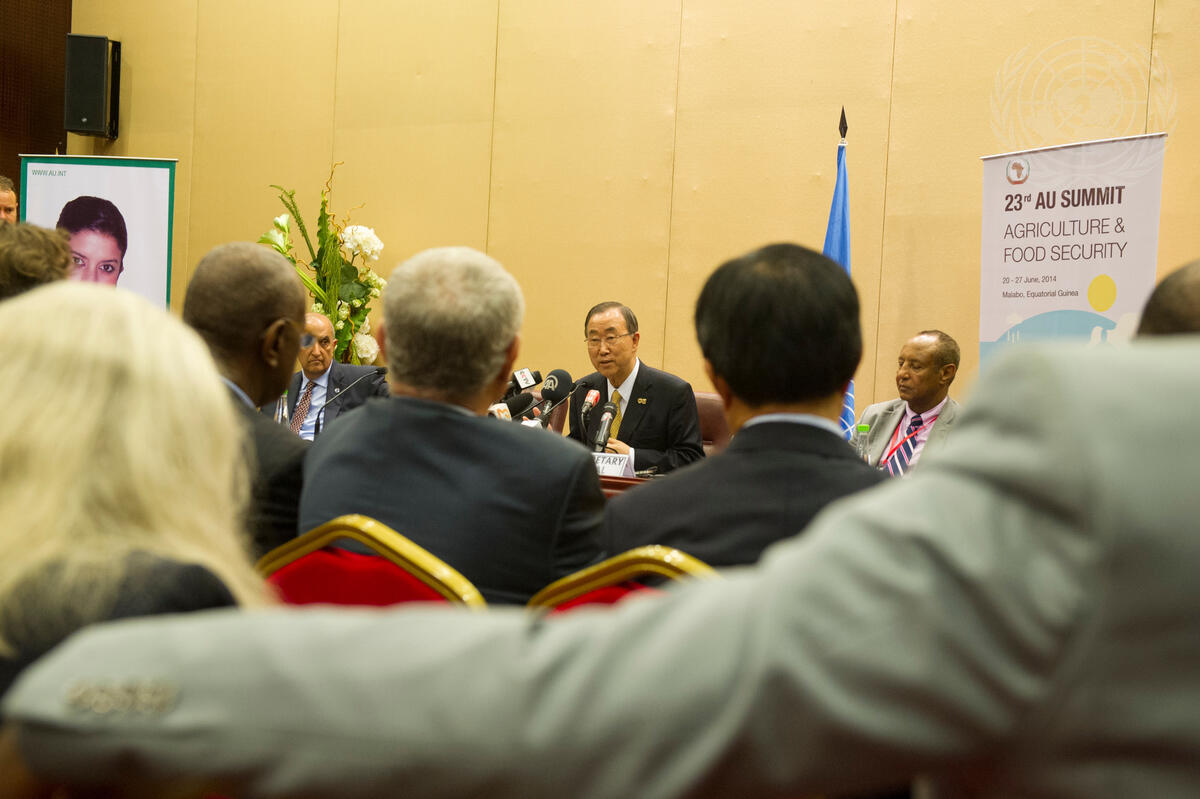 Secretary-General Ban Ki-moon (centre) addresses a press conference at the African Union (AU) Summit in Malabo, Equatorial Guinea.
