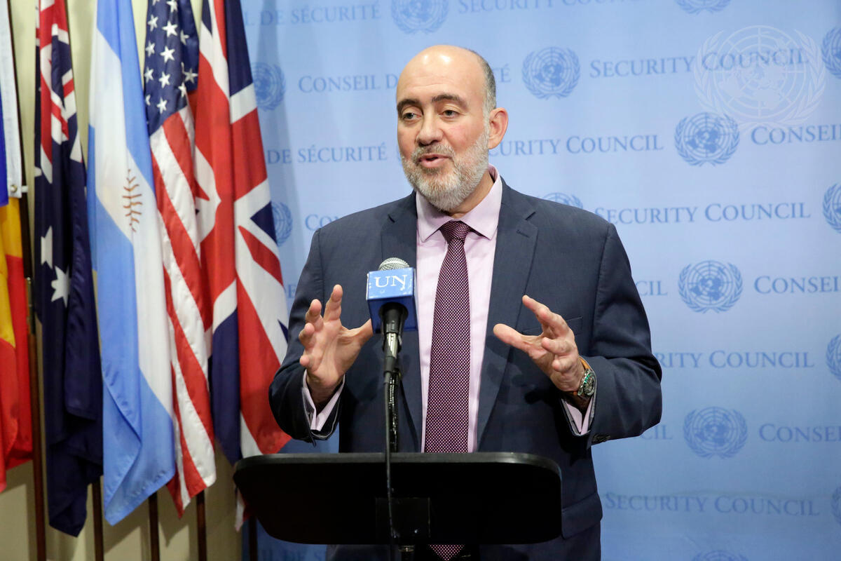 Ron Prosor, Permanent Representative of Israel to the UN, speaks to journalists following a Security Council meeting on the current crisis in Israel and the Gaza Strip.