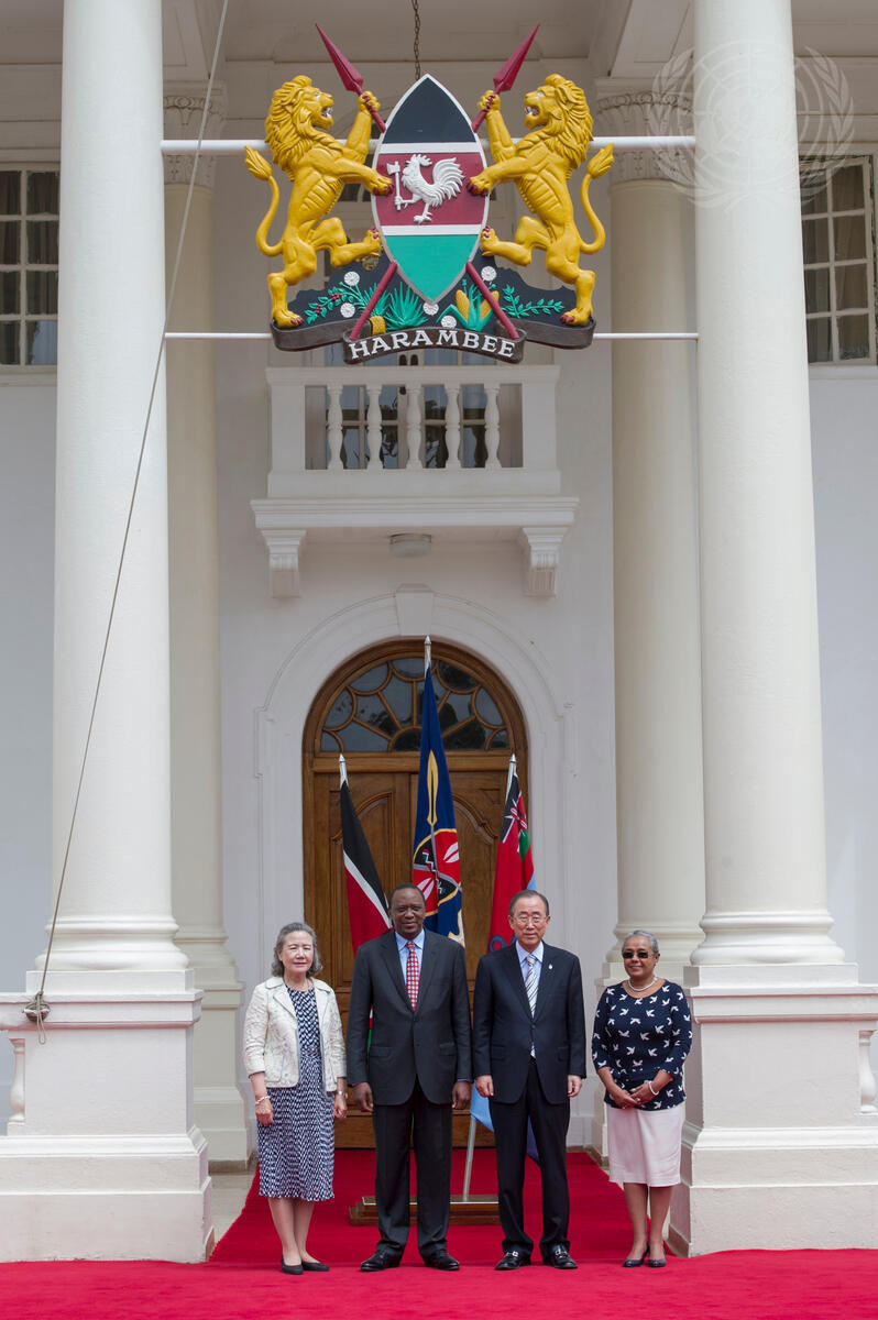 Secretary-General Ban Ki-moon (centre right) and Uhuru Kenyatta (centre left), President of the Republic of Kenya, pose for a group photo with their wives, Yoo Soon-taek (left) and Margaret Gakuo Kenyatta, who in January launched the 'Beyond Zero Campaign' to accelerate the implementation of Kenya's national plan towards improving maternal and newborns' lives.