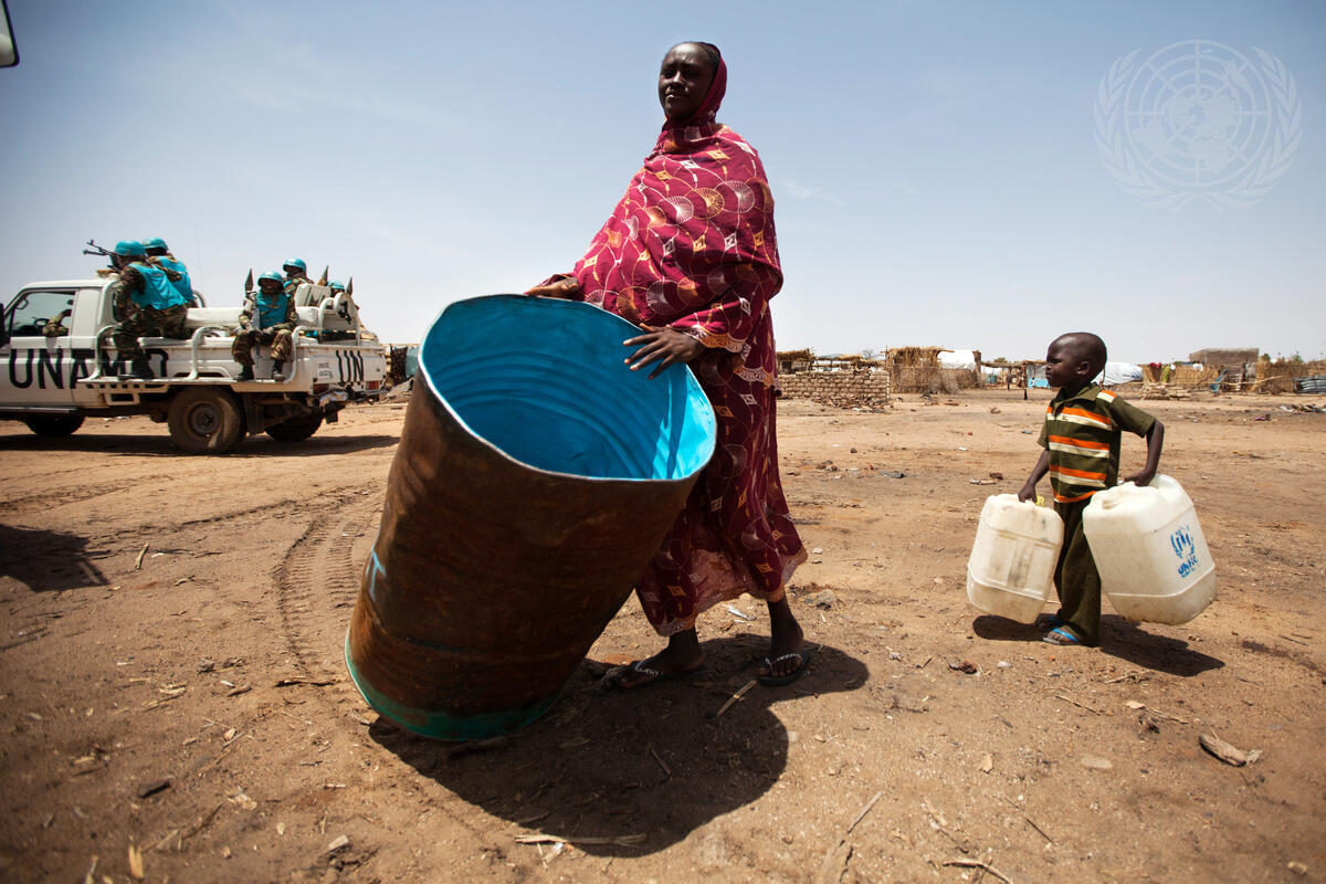 A women pushes a water tank while her child carries two jerry cans to collect water provided by the African Union-United Nations Hybrid Operation in Darfur (UNAMID) Khor Abeche camp for internally displaced persons (IDPs) in South Darfur, Sudan. The camp encompasses approximately 70,000 square metres, has watch towers with UNAMID personnel deployed 24 hours a day, and is equipped with solar power, two community centres and public latrines.