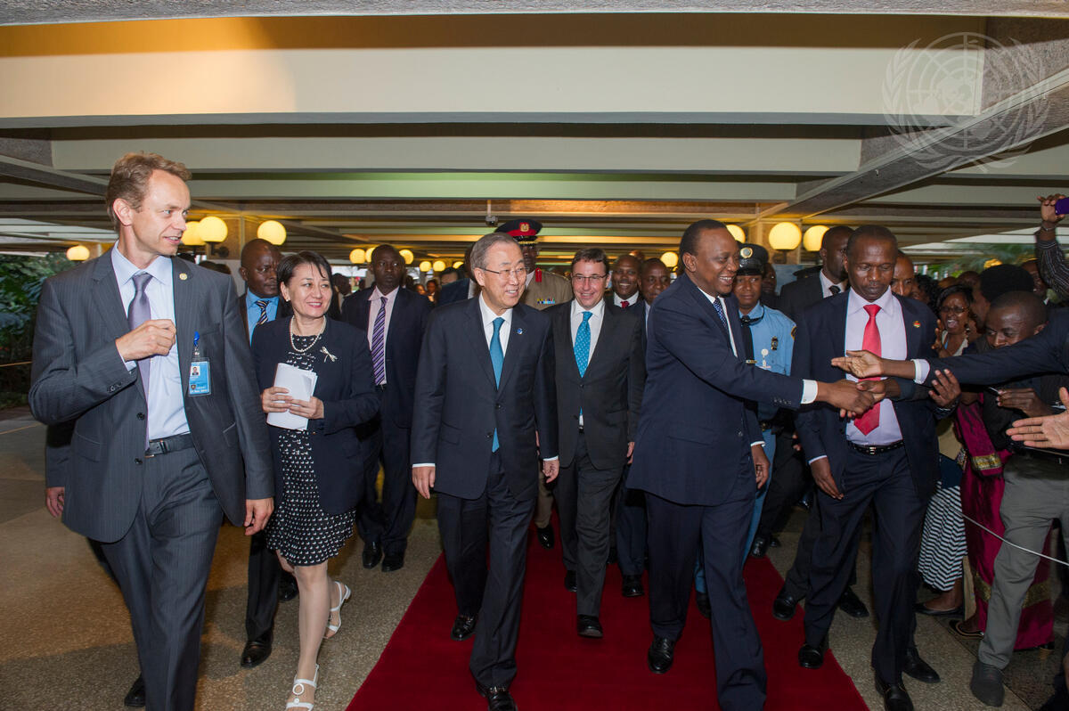 Secretary-General Ban Ki-moon (third from left) attends Closing Ceremony of the United Nations Environment Assembly (UNEA) along with Uhuru Kenyatta (centre right, shaking hands), President of the Republic of Kenya, and Achim Steiner, Executive Director of the UN Environment Programme (UNEP) (centre).