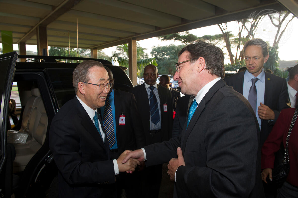 Secretary-General Ban Ki-moon (left) greets Achim Steiner, Executive Director of the UN Environment Programme (UNEP) at the Closing Ceremony of the United Nations Environment Assembly (UNEA) in Nairobi.