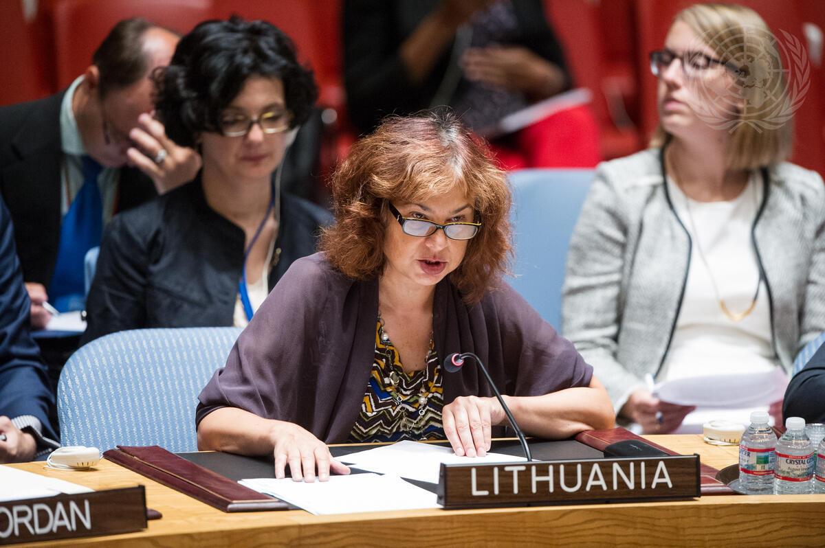 Raimonda Murmokaite, Permanent Representative of Lithuania to the UN and Chair of the Security Council sanctions committee concerning the Central African Republic briefs the Security Council at its meeting on the situation in that country.