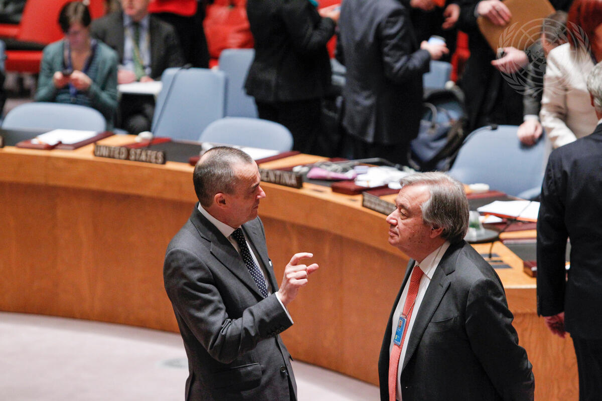 Gérard Araud (left), Permanent Representative of France to the UN, speaks with António Guterres), UN High Commissioner for Refugees, prior to the Security Council’s meeting on the situation in the Central African Republic.