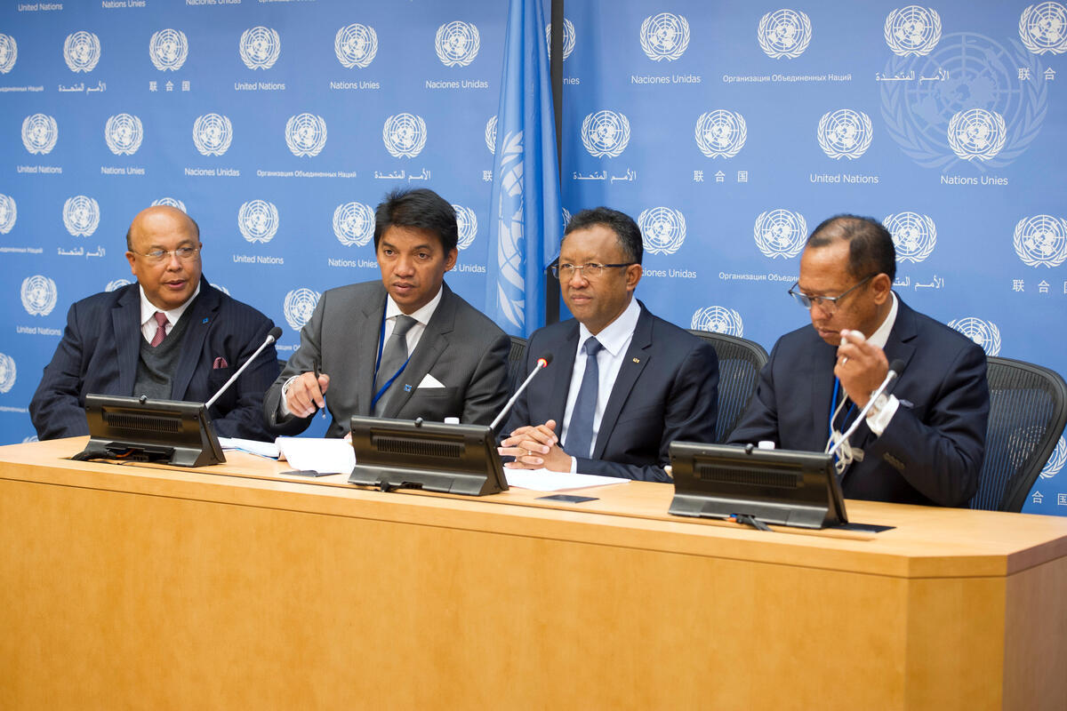 Rajaonarimampianina Rakotoarimanana (centre right), President of the Republic of Madagascar, addresses a press conference at UN Headquarters in New York. Also pictured (from left): Zina Andrianarivelo-Razafy, Permanent Representative of the Republic of Madagascarto the UN; Henry Rabary-Njaka, Chef de Cabinet to the President; Solofo Rasoarahona, Chief of Staff to the Minister of Finance.