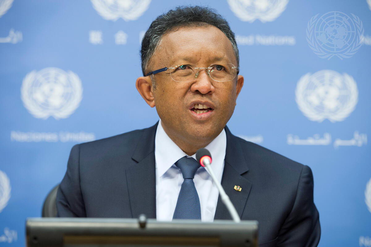 Hery Martial Rajaonarimampianina Rakotoarimanana, President of the Republic of Madagascar, addresses a press conference at UN Headquarters in New York.