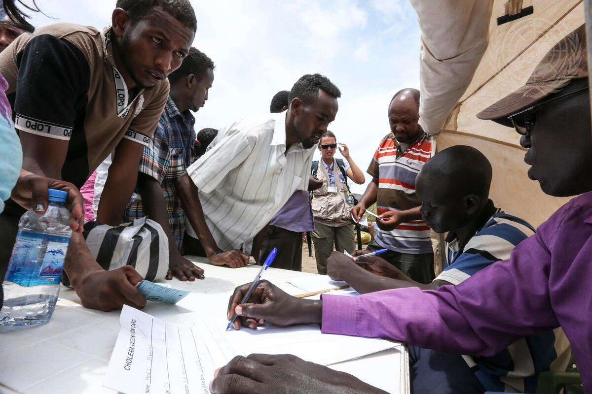 Here, displaced foreign nationals from Ethiopia, Somalia and Eritrea, who have lost their belongings register to stay at the UN House in Juba, South Sudan.